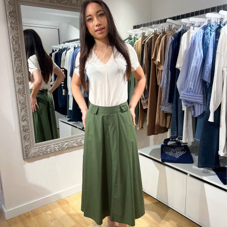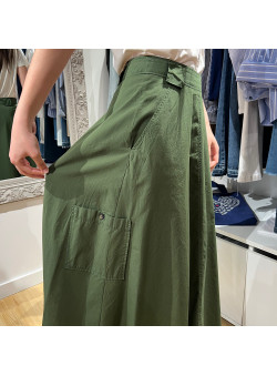 La jupe jomo est cargo , mi longue , avec les poches sur le devant et une poche plaquée ainsi que des boutons sur le côté. Elle est 100% coton. Idéal pour la saison grâce à sa matière qui rend la jupe hyper confort à porter !
