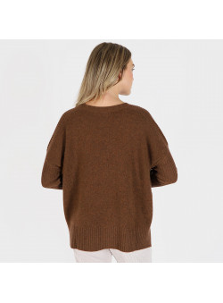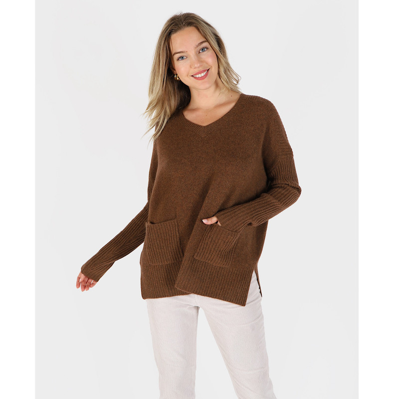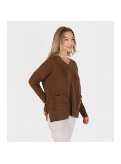 Pull cachemire couleur noisette col V détails au manches et 2 poches à l’avant du pull